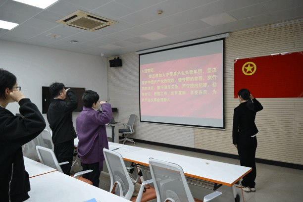 团徽颁发环节,杜瑶、付强为新团员逐一佩戴团徽。佩戴好崭新的团徽后,18名新团员在领誓人徐心悦的带领下,高举右拳、面向团旗庄严宣誓,铿锵有力的誓言,彰显着新时代青年的使命与担当,激荡着青春的梦想与朝气。