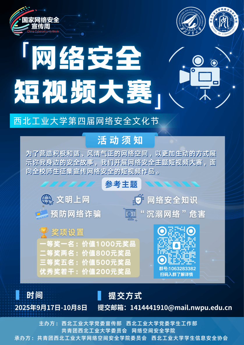 第四届网络安全文化节期间将举办短视频大赛,面向全校师生征集网络安全的短视频作品。